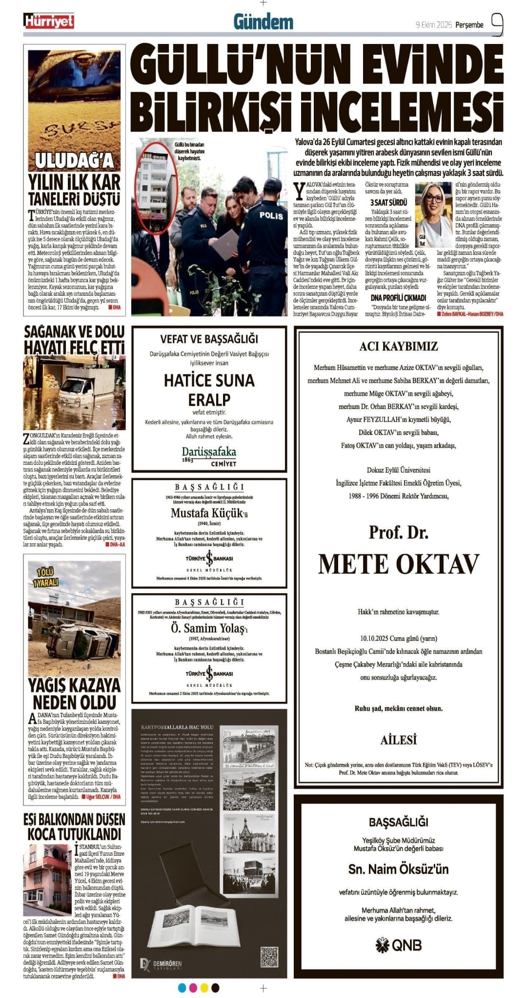 09 Ekim 2025 Hürriyet Gazetesi Vefat İlanları