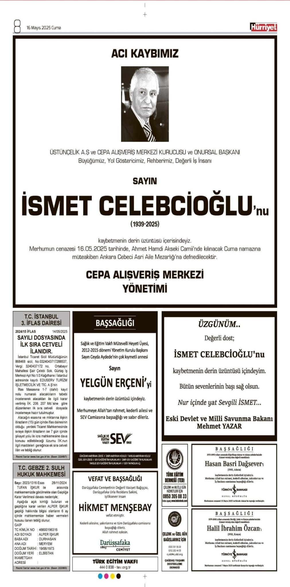 16 Mayıs 2025 tarihinde Hürriyet Gazetesi’nde yayımlanan vefat, başsağlığı, anma, ölüm ve teşekkür ilanlarını aşağıda bulabilirsiniz.