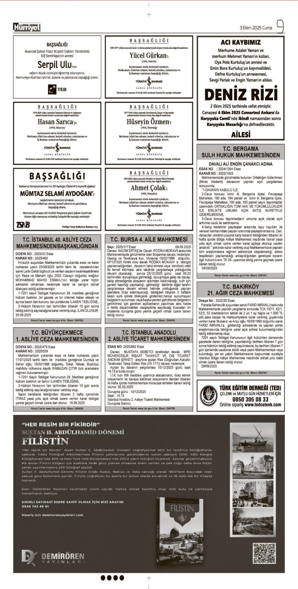 Hürriyet Vefat Teşekkür Anma | Bugünkü ilanlar 03.10.2025